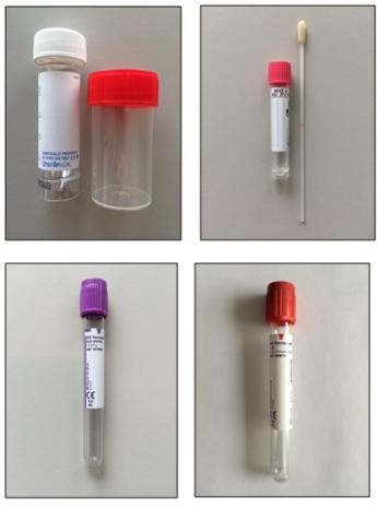 Diverse steriele containers, wattenstok eSwab (roze dop), bloedbuis voor EDTA-bloed (6,0 ml, paarse dop), bloedbuis voor stolbloed (6,0 ml, rode dop)