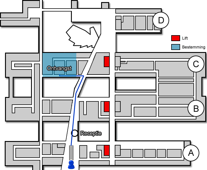 U neemt de roltrap naar de Boulevard. Daarna loopt u rechtdoor langs de infobalie. U volgt de Boulevard. Voor de geldmaat gaat u linksaf. U bevindt zich nu in het C-gebouw. De polikliniek Dermatologie bevindt zich aan uw rechterhand.